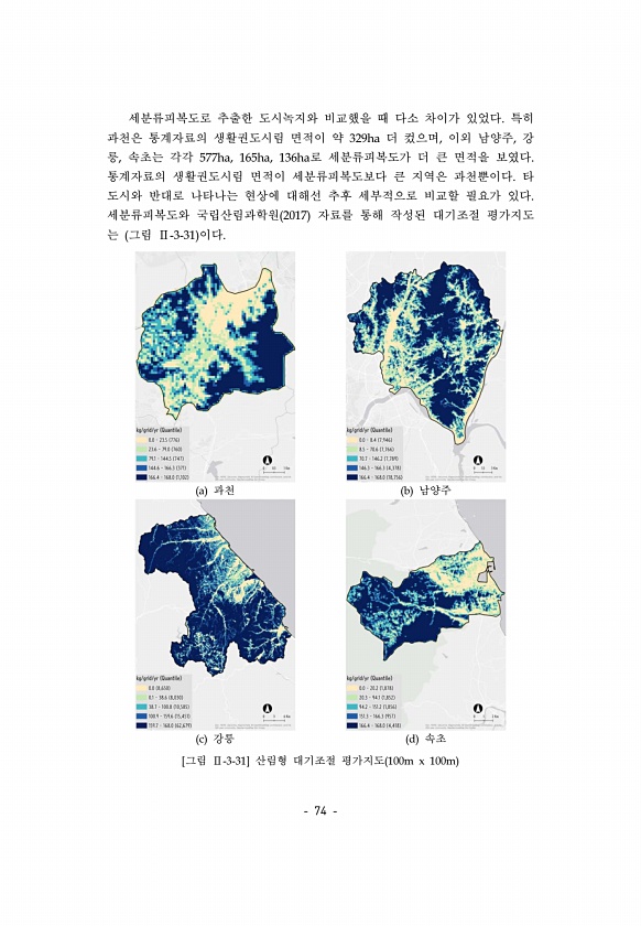 74 세분류피복도로 추출한 도시녹지와 비교했을 때 다소 차이가 있었다. 특히 과천은 통계자료의 생활권도시림 면적이 약 329ha 더 컸으며, 이외 남양주, 강 릉, 속초는 각각 577ha, 165ha, 136ha로 세분류피복도가 더 큰 면적을 보였다. 통계자료의 생활권도시림 면적이 세분류피복도보다 큰 지역은 과천뿐이다. 타 도시와 반대로 나타나는 현상에 대해선 추후 세부적으로 비교할 필요가 있다. 세분류피복도와 국립산림과학원 2017 자료를 통해 작성된 대기조절 평가지도 는 그림 Ⅱ-3-31 이다. a 과천 b 남양주 c 강릉 d 속초 [그림 Ⅱ-3-31] 산림형 대기조절 평가지도 100m x 100m