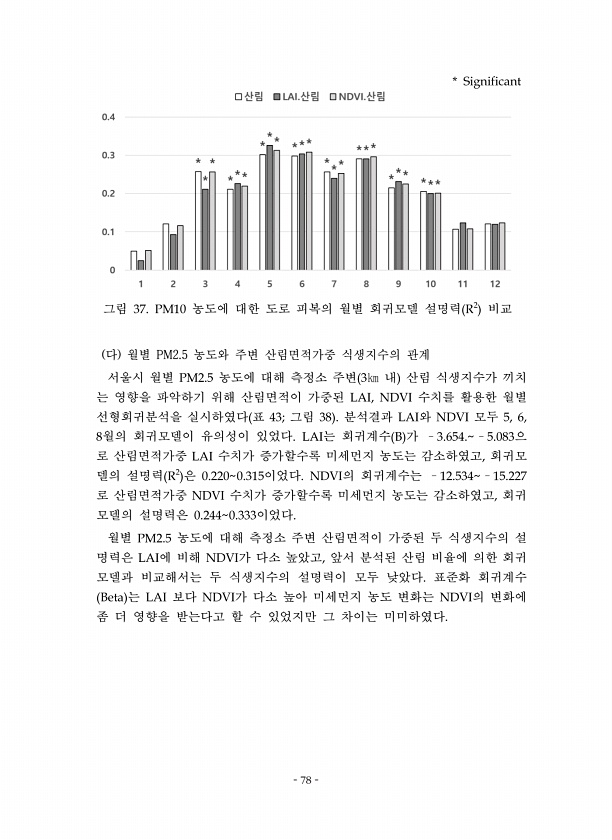 78 그림 농도에 대한 도로 피복의 월별 회귀모델 설명력 비교 다 월별 PM2.5 농도와 주변 산림면적가중 식생지수의 관계 서울시 월별 농도에 대해 측정소 주변 내 산림 식생지수가 끼치 는 영향을 파악하기 위해 산림면적이 가중된 수치를 활용한 월별 선형회귀분석을 실시하였다 표 그림 분석결과 와 모두 월의 회귀모델이 유의성이 있었다 는 회귀계수 가 으 로 산림면적가중 수치가 증가할수록 미세먼지 농도는 감소하였고 회귀모 델의 설명력 은 이었다 의 회귀계수는 로 산림면적가중 수치가 증가할수록 미세먼지 농도는 감소하였고 회귀 모델의 설명력은 이었다 월별 농도에 대해 측정소 주변 산림면적이 가중된 두 식생지수의 설 명력은 에 비해 가 다소 높았고 앞서 분석된 산림 비율에 의한 회귀 모델과 비교해서는 두 식생지수의 설...