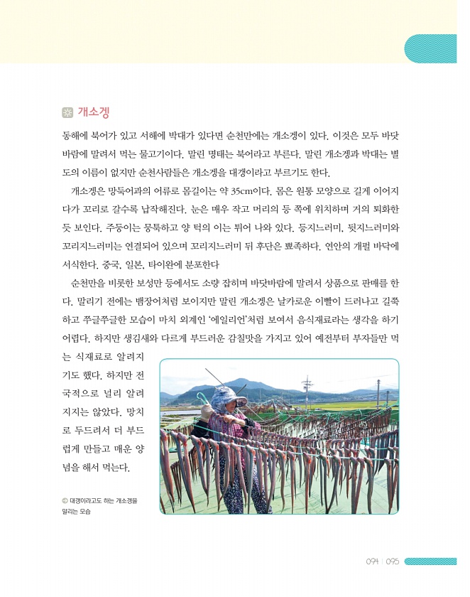 094 095 개소겡 동해에 북어가 있고 서해에 박대가 있다면 순천만에는 개소겡이 있다. 이것은 모두 바닷 바람에 말려서 먹는 물고기이다. 말린 명태는 북어라고 부른다. 말린 개소겡과 박대는 별 도의 이름이 없지만 순천사람들은 개소겡을 대갱이라고 부르기도 한다. 개소겡은 망둑어과의 어류로 몸길이는 약 35cm이다. 몸은 원통 모양으로 길게 이어지 다가 꼬리로 갈수록 납작해진다. 눈은 매우 작고 머리의 등 쪽에 위치하며 거의 퇴화한 듯 보인다. 주둥이는 뭉툭하고 양 턱의 이는 튀어 나와 있다. 등지느러미, 뒷지느러미와 꼬리지느러미는 연결되어 있으며 꼬리지느러미 뒤 후단은 뾰족하다. 연안의 개펄 바닥에 서식한다. 중국, 일본, 타이완에 분포한다 순천만을 비롯한 보성만 등에서도 소량 잡히며 바닷바람에 말려서 상품...