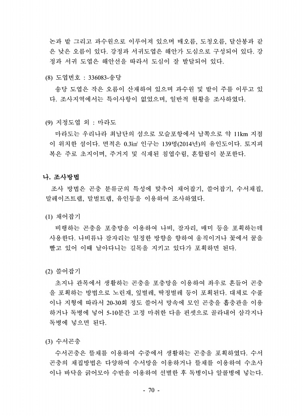 70 논과 밭 그리고 과수원으로 이루어져 있으며 매오름, 도청오름, 달산봉과 같 은 낮은 오름이 있다. 강정과 서귀도엽은 해안가 도심으로 구성되어 있다. 강 정과 서귀 도엽은 해안선을 따라서 도심이 잘 발달되어 있다. 8 도엽번호 336083-송당 송당 도엽은 작은 오름이 산재하여 있으며 과수원 및 밭이 주를 이루고 있 다. 조사지역에서는 특이사항이 없었으며, 일반적 현황을 조사하였다. 9 지정도엽 외 마라도 마라도는 우리나라 최남단의 섬으로 모슬포항에서 남쪽으로 약 11km 지점 이 위치한 섬이다. 면적은 0.3㎢ 인구는 139명 2014년 의 유인도이다. 토지피 복은 주로 초지이며, 주거지 및 식재된 침엽수림, 혼합림이 분포한다. 나. 조사방법 조사 방법은 곤충 분류군의 특성에 맞추어 채어잡기, 쓸어잡기...