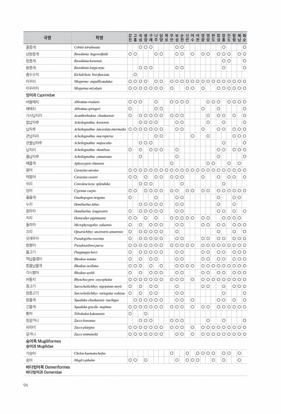 94 줄종개 Cobitis tetralineata ○ ○ ○ ○ ○ ○ ○ 남방종개 Iksookimia hugowolfeldi ○ ○ ○ ○ ○ ○ ○ ○ ○ ○ ○ ○ ○ ○ 참종개 Iksookimia koreensis ○ ○ ○ 왕종개 Iksookimia longicorpa ○ ○ ○ ○ ○ ○ ○ 좀수수치 Kichulchoia brevifasciata ○ 미꾸리 Misgurnus anguillicaudatus ○ ○ ○ ○ ○ ○ ○ ○ ○ ○ ○ ○ ○ ○ ○ ○ ○ ○ ○ ○ ○ 미꾸라지 Misgurnus mizolepis ○ ○ ○ ○ ○ ○ ○ ○ ○ ○ ○ ○ ○ ○ ○ ○ ○ 잉어과 Cyprinidae 버들매치 Abbottina rivularis ○ ○ ○ ○ ○ ○ ○ ○ ○ ○ ○ ○ ○...