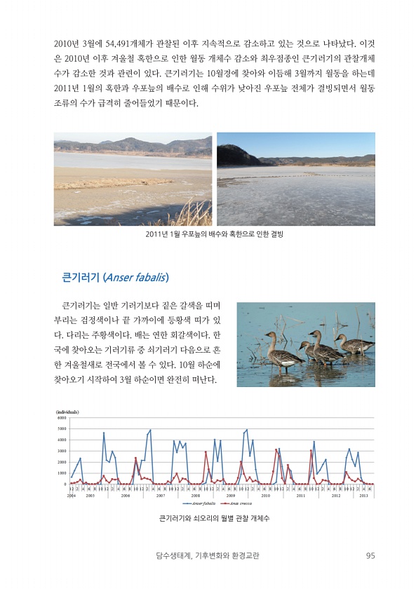 담수생태계, 기후변화와 환경교란 95 2010년 3월에 54,491개체가 관찰된 이후 지속적으로 감소하고 있는 것으로 나타났다. 이것 은 2010년 이후 겨울철 혹한으로 인한 월동 개체수 감소와 최우점종인 큰기러기의 관찰개체 수가 감소한 것과 관련이 있다. 큰기러기는 10월경에 찾아와 이듬해 3월까지 월동을 하는데 2011년 1월의 혹한과 우포늪의 배수로 인해 수위가 낮아진 우포늪 전체가 결빙되면서 월동 조류의 수가 급격히 줄어들었기 때문이다. 큰기러기 Anser fabalis 큰기러기는 일반 기러기보다 짙은 갈색을 띠며 부리는 검정색이나 끝 가까이에 등황색 띠가 있 다. 다리는 주황색이다. 배는 연한 회갈색이다. 한 국에 찾아오는 기러기류 중 쇠기러기 다음으로 흔 한 겨울철새로 전국에서 볼 수 있다. 10...