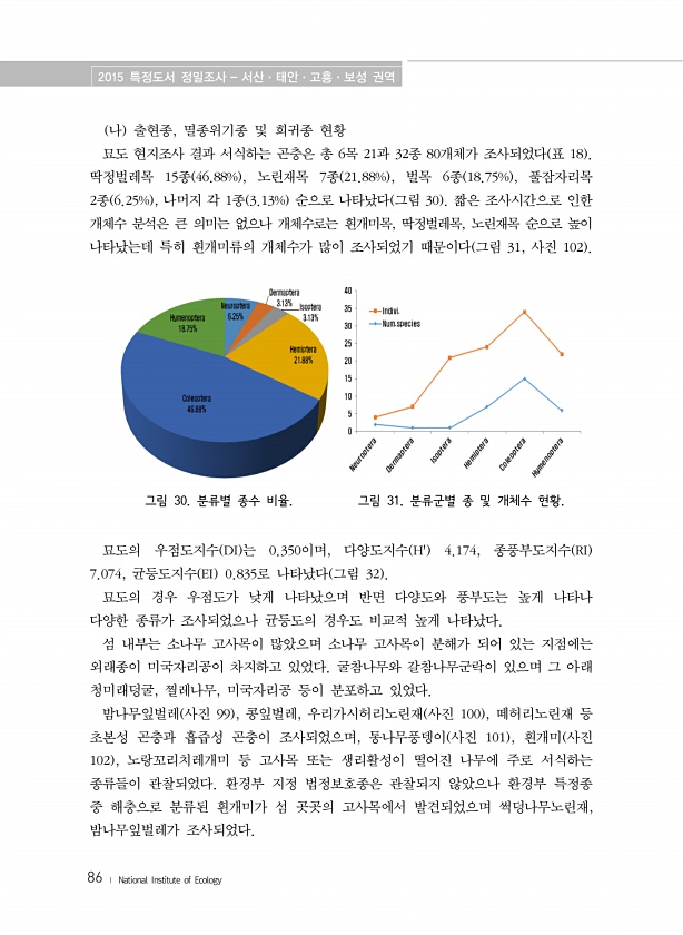 2015 특정도서 정밀조사 서산·태안·고흥·보성 권역 86 ? National Institute of Ecology 나 출현종, 멸종위기종 및 희귀종 현황 묘도 현지조사 결과 서식하는 곤충은 총 6목 21과 32종 80개체가 조사되었다 표 18 딱정벌레목 15종 46.88% , 노린재목 7종 21.88% , 벌목 6종 18.75% , 풀잠자리목 2종 6.25% , 나머지 각 1종 3.13% 순으로 나타났다 그림 30 짧은 조사시간으로 인한 개체수 분석은 큰 의미는 없으나 개체수로는 흰개미목, 딱정벌레목, 노린재목 순으로 높이 나타났는데 특히 흰개미류의 개체수가 많이 조사되었기 때문이다 그림 31, 사진 102 그림 30. 분류별 종수 비율. 그림 31. 분류군별 종 및 개체수 현황. 묘도의 우점도지수 DI ...