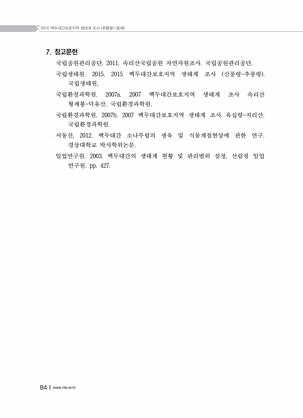 2016 백두대간보호지역 생태계 조사 추풍령밀재 84Ⅰwww.nie.re.kr 7. 참고문헌 국립공원관리공단. 2011. 속리산국립공원 자연자원조사. 국립공원관리공단. 국립생태원. 2015. 2015 백두대간보호지역 생태계 조사 신풍령추풍령 국립생태원. 국립환경과학원. 2007a. 2007 백두대간보호지역 생태계 조사 속리산 형제봉덕유산. 국립환경과학원. 국립환경과학원. 2007b. 2007 백두대간보호지역 생태계 조사 육십령지리산. 국립환경과학원. 서동진. 2012. 백두대간 소나무림의 생육 및 식물계절현상에 관한 연구. 경상대학교 박사학위논문. 임업연구원. 2003. 백두대간의 생태계 현황 및 관리범위 설정. 산림청 임업 연구원. pp.427.