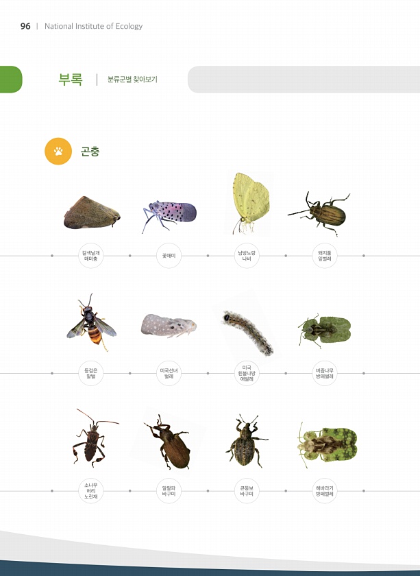 부록 분류군별 찾아보기 곤충 갈색날개 매미충 등검은 말벌 소나무 허리 노린재 꽃매미 미국선녀 벌레 알팔파 바구미 남방노랑 나비 미국 흰불나방 애벌레 큰뚱보 바구미 돼지풀 잎벌레 버즘나무 방패벌레 해바라기 방패벌레 96 National Institute ofEcology