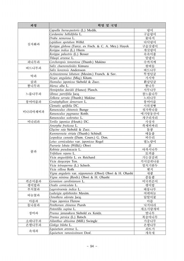 2018 백두대간보호지역 생태계 조사 댓재 삽당령 86 ? National Institute of Ecology 4 분석방법 본 조사에서 밝혀진 관속식물목록을 토대로 환경부 법정보호종 환경부, 2013 , 한반도 고유종 환경부·국립생물자원관, 2014 , 국가적색목록 환경부·국립생물자원관, 2012 , 식물구계학적특정식물 환경부·국립생태원, 2014 , 생태계교란식물을 포함한 외래식물 박, 2009; 이 등, 2011; 환경부, 2013 등의 분포 현황을 파악하였다. 3. 조사결과 가. 현지조사 결과 1 조사지역 전체 출현 현황 확증표본을 근거로 한 백두대간 댓재삽당령 의 식물상은 91과 247속 381종 6아종 33변종 1품종의 421분류군으로 양치식물 23분류군, 나자식물 4분류군, 피자식물 중 쌍자엽식...
