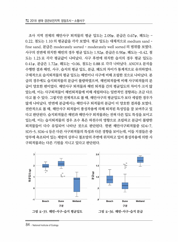 2018 생태·경관보전지역 정밀조사 소황사구 84 ? National Institute of Ecology 조사 지역 전체의 해안사구 퇴적물의 평균 입도는 2.09φ, 분급은 0.67φ, 왜도는 ? 0.22, 첨도는 1.10 의 평균값을 각각 보였다. 평균 입도는 대체적으로 medium sand fine sand, 분급은 moderately sorted moderately well sorted 의 범위를 보였다. 사구의 전면에 위치한 해빈의 경우 평균 입도는 1.92φ, 분급은 0.90φ, 왜도는 -0.42, 첨 도는 1.23 로 각각 평균값이 나타났다. 사구 후면에 위치한 습지의 경우 평균 입도는 0.41φ, 분급은 1.72φ, 왜도는 ?0.06, 첨도는 0.88 로 각각 나타났다. ANOVA 분석을 수행...