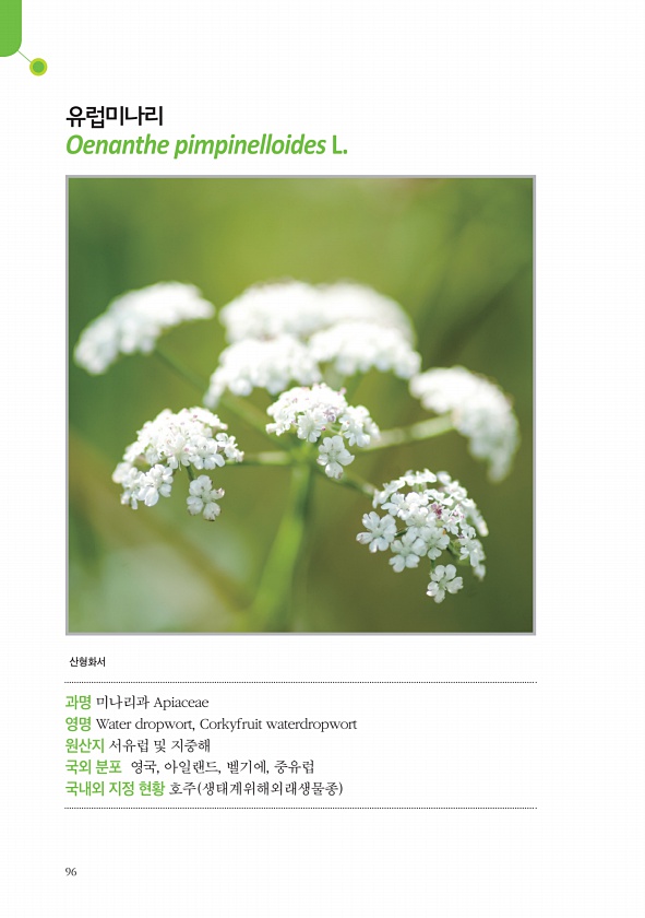 96 유럽미나리 Oenanthe pimpinelloides L. 과명 미나리과 Apiaceae 영명 Water dropwort, Corkyfruit waterdropwort 원산지 서유럽 및 지중해 국외 분포 영국, 아일랜드, 벨기에, 중유럽 국내외 지정 현황 호주 생태계위해외래생물종산형화서
