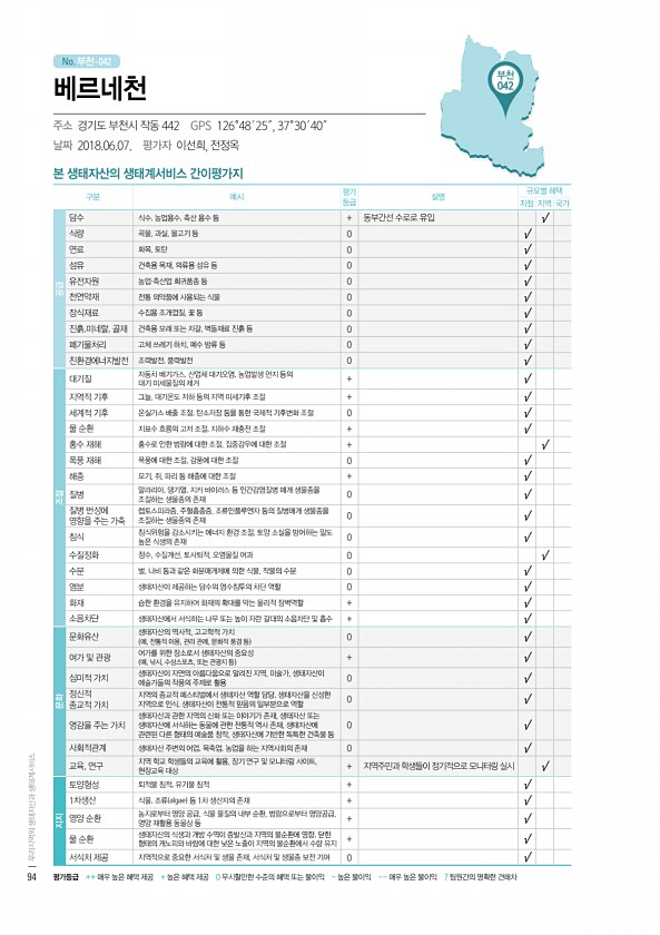 No. 부천- 본 생태자산의 생태계서비스 간이평가지 구분 예시 평가 등급 설명 규모별 혜택 지점 지역 국가 공급 담수 식수, 농업용수, 축산 용수 등 + 동부간선 수로로 유입 √ 식량 곡물, 과실, 물고기 등 0 √ 연료 화목, 토탄 0 √ 섬유 건축용 목재, 의류용 섬유 등 0 √ 유전자원 농업·축산업 희귀품종 등 0 √ 천연약재 전통 의약품에 사용되는 식물 0 √ 장식재료 수집용 조개껍질, 꽃 등 0 √ 진흙,미네랄, 골재 건축용 모래 또는 자갈, 벽돌재료 진흙 등 0 √ 폐기물처리 고체 쓰레기 하치, 폐수 방류 등 0 √ 친환경에너지발전 조력발전, 풍력발전 0 √ 조절 대기질 자동차 배기가스, 산업체 대기오염, 농업발생 먼지 등의 대기 미세물질의 제거 + √ 지역적 기후 그늘, 대기온도 저하 등의 지역...
