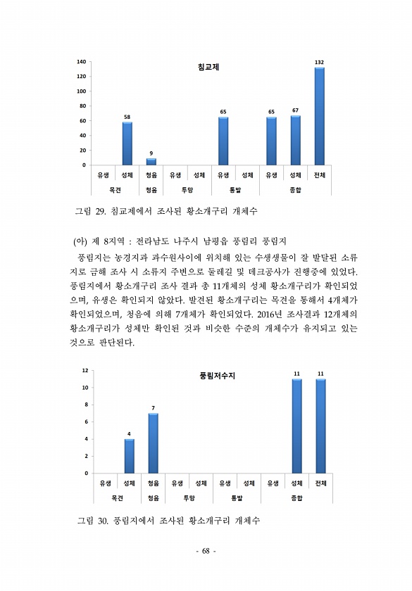 68 그림 29. 침교제에서 조사된 황소개구리 개체수 아 제 8지역 전라남도 나주시 남평읍 풍림리 풍림지 풍림지는 농경지과 과수원사이에 위치해 있는 수생생물이 잘 발달된 소류 지로 금해 조사 시 소류지 주변으로 둘레길 및 데크공사가 진행중에 있었다. 풍림지에서 황소개구리 조사 결과 총 11개체의 성체 황소개구리가 확인되었 으며, 유생은 확인되지 않았다. 발견된 황소개구리는 목견을 통해서 4개체가 확인되었으며, 청음에 의해 7개체가 확인되었다. 2016년 조사결과 12개체의 황소개구리가 성체만 확인된 것과 비슷한 수준의 개체수가 유지되고 있는 것으로 판단된다. 그림 30. 풍림지에서 조사된 황소개구리개체수