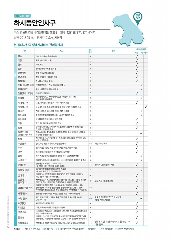 No. 강릉- 본 생태자산의 생태계서비스 간이평가지 구분 예시 평가 등급 설명 규모별 혜택 지점 지역 국가 공급 담수 식수, 농업용수, 축산 용수 등 + √ 식량 곡물, 과실, 물고기 등 0 √ 연료 화목, 토탄 + √ 섬유 건축용 목재, 의류용 섬유 등 + √ 유전자원 농업·축산업 희귀품종 등 0 √ 천연약재 전통 의약품에 사용되는 식물 0 √ 장식재료 수집용 조개껍질, 꽃 등 + √ 진흙, 미네랄, 골재 건축용 모래 또는 자갈, 벽돌재료 진흙 등 + √ 폐기물처리 고체 쓰레기 하치, 폐수 방류 등 0 √ 친환경에너지발전 조력발전, 풍력발전 0 √ 조절 대기질 자동차 배기가스, 산업체 대기오염, 농업발생 먼지 등의 대기 미세물질의 제거 + √ 지역적 기후 그늘, 대기온도 저하 등의 지역 미세기후 조절 + ...