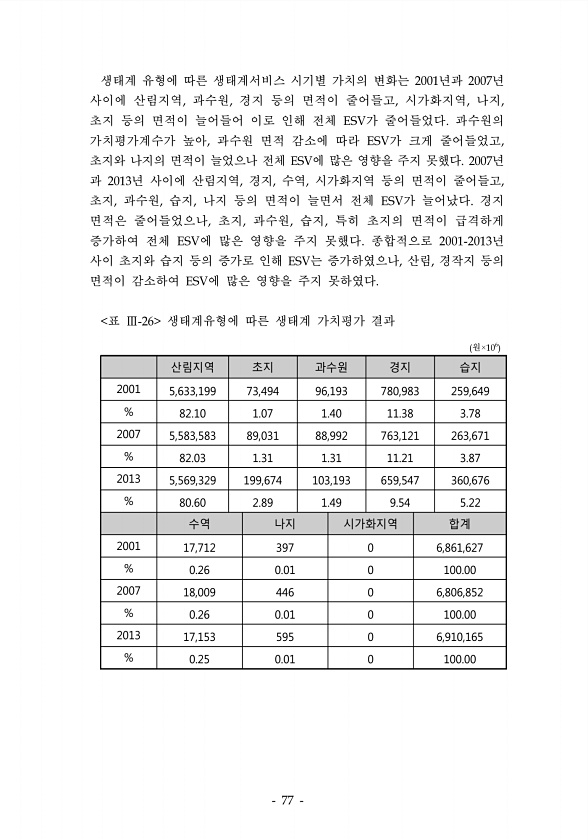 생태계 유형에 따른 생태계서비스 시기별 가치의 변화는 년과 년 사이에 산림지역 과수원 경지 등의 면적이 줄어들고 시가화지역 나지 초지 등의 면적이 늘어들어 이로 인해 전체 가 줄어들었다 과수원의 가치평가계수가 높아 과수원 면적 감소에 따라 가 크게 줄어들었고 초지와 나지의 면적이 늘었으나 전체 에 많은 영향을 주지 못했다 년 과 년 사이에 산림지역 경지 수역 시가화지역 등의 면적이 줄어들고 초지 과수원 습지 나지 등의 면적이 늘면서 전체 가 늘어났다 경지 면적은 줄어들었으나 초지 과수원 습지 특히 초지의 면적이 급격하게 증가하여 전체 에 많은 영향을 주지 못했다 종합적으로 년 사이 초지와 습지 등의 증가로 인해 는 증가하였으나 산림 경작지 등의 면적이 감소하여 에 많은 영향을 주지 못하였다 원 산림지역 초지...