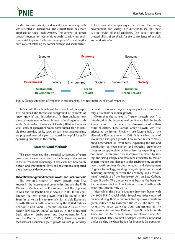 83 handled to some extent, the demand for economic growth was reflected in discussions. The current trend has more emphasis on social inclusiveness. The concept of ‘green growth’ focuses on ‘economic growth’ considering environmental impacts. ‘Inclusive green growth’ is a strengthened concept retaining the former concept and social factor. In fact, since all concepts argue the balance of economy, ...