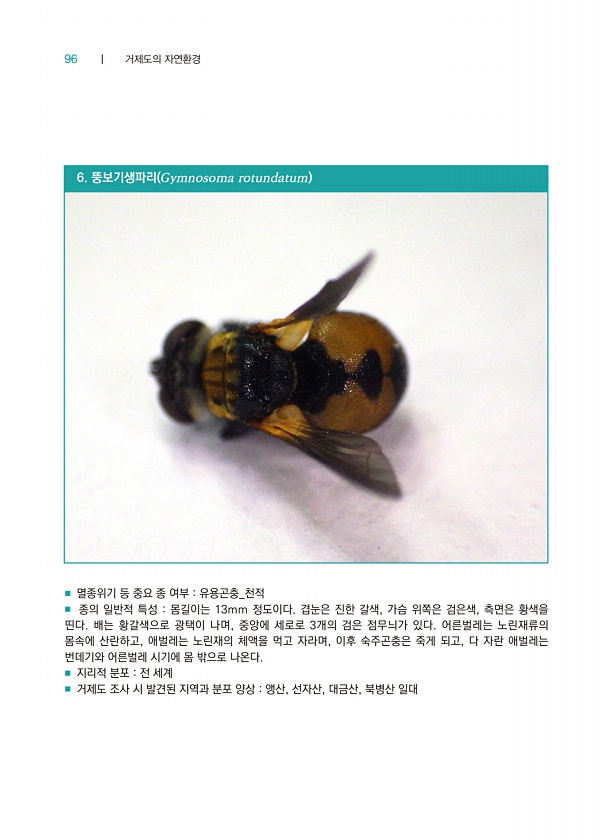 96 ┃ 거제도의 자연환경 6. 뚱보기생파리 Gymnosoma rotundatum ■ 멸종위기 등 중요 종 여부 유용곤충_천적 ■ 종의 일반적 특성 몸길이는 13mm 정도이다. 겹눈은 진한 갈색, 가슴 위쪽은 검은색, 측면은 황색을 띤다. 배는 황갈색으로 광택이 나며, 중앙에 세로로 3개의 검은 점무늬가 있다. 어른벌레는 노린재류의 몸속에 산란하고, 애벌레는 노린재의 체액을 먹고 자라며, 이후 숙주곤충은 죽게 되고, 다 자란 애벌레는 번데기와 어른벌레 시기에 몸 밖으로 나온다. ■ 지리적 분포 전 세계 ■ 거제도 조사 시 발견된 지역과 분포 양상 앵산, 선자산, 대금산, 북병산일대