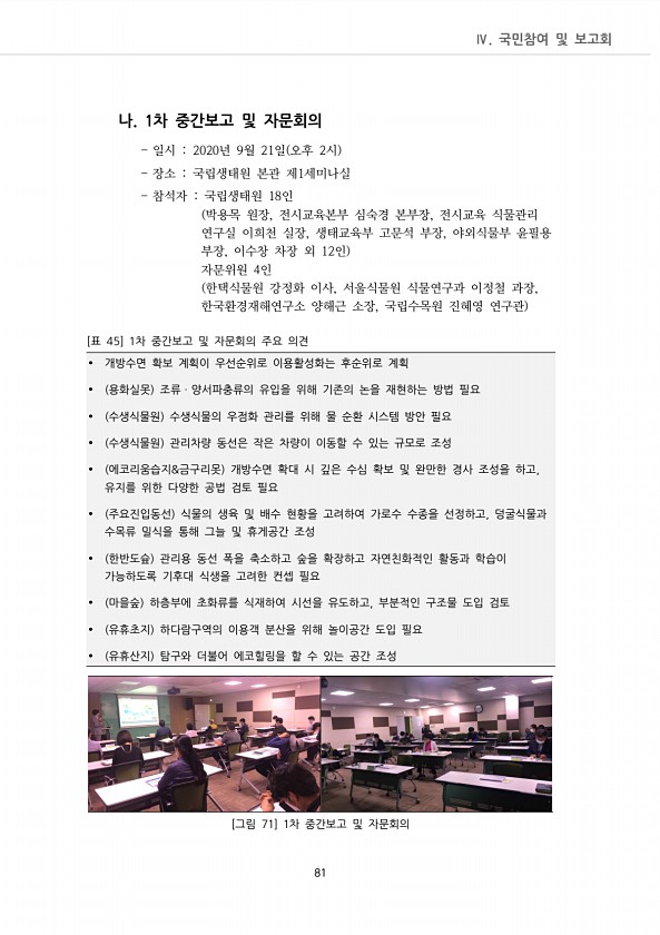 Ⅳ. 국민참여 및 보고회 81 나. 1차 중간보고 및 자문회의 일시 2020년 9월 21일 오후 2시 장소 국립생태원 본관 제1세미나실 참석자 국립생태원 18인 박용목 원장, 전시교육본부 심숙경 본부장, 전시교육 식물관리 연구실 이희천 실장, 생태교육부 고문석 부장, 야외식물부 윤필용 부장, 이수창 차장 외 12인 자문위원 4인 한택식물원 강정화 이사, 서울식물원 식물연구과 이정철 과장, 한국환경재해연구소 양해근 소장, 국립수목원 진혜영 연구관 ? 개방수면 확보 계획이 우선순위로 이용활성화는 후순위로 계획 ? 용화실못 조류ㆍ양서파충류의 유입을 위해 기존의 논을 재현하는 방법 필요 ? 수생식물원 수생식물의 우점화 관리를 위해 물 순환 시스템 방안 필요 ? 수생식물원 관리차량 동선은 작은 차량이 이동할 수 있는...