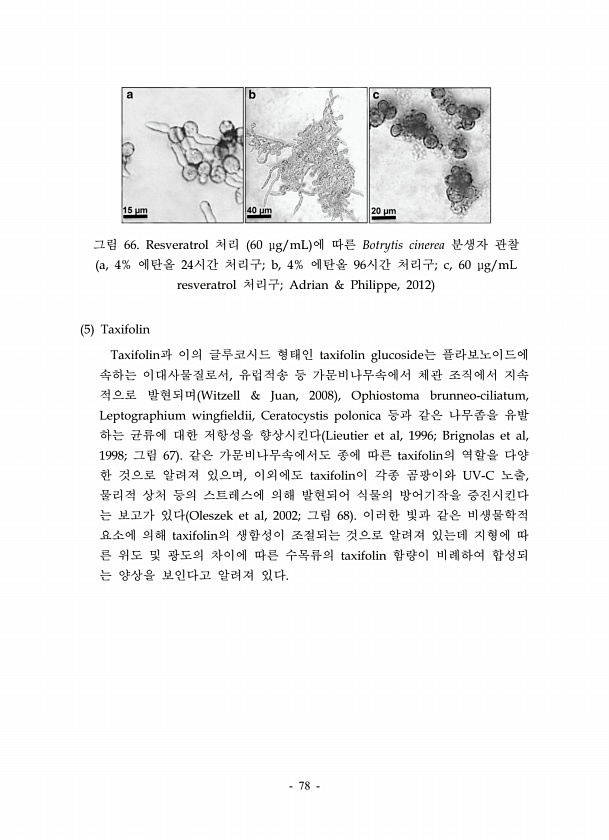 78 그림 66. Resveratrol 처리 60 μg/mL 에 따른 Botrytis cinerea 분생자 관찰 a, 4% 에탄올 24시간 처리구; b, 4% 에탄올 96시간 처리구; c, 60 μg/mL resveratrol 처리구; Adrian & Philippe, 2012 5 Taxifolin Taxifolin과 이의 글루코시드 형태인 taxifolin glucoside는 플라보노이드에 속하는 이대사물질로서, 유럽적송 등 가문비나무속에서 체관 조직에서 지속 적으로 발현되며 Witzell & Juan, 2008 , Ophiostoma brunneo-ciliatum, Leptographium wingfieldii, Ceratocystis polonica 등과 같은 나무좀을 유발 하는 균류에 대한 저항성을 ...