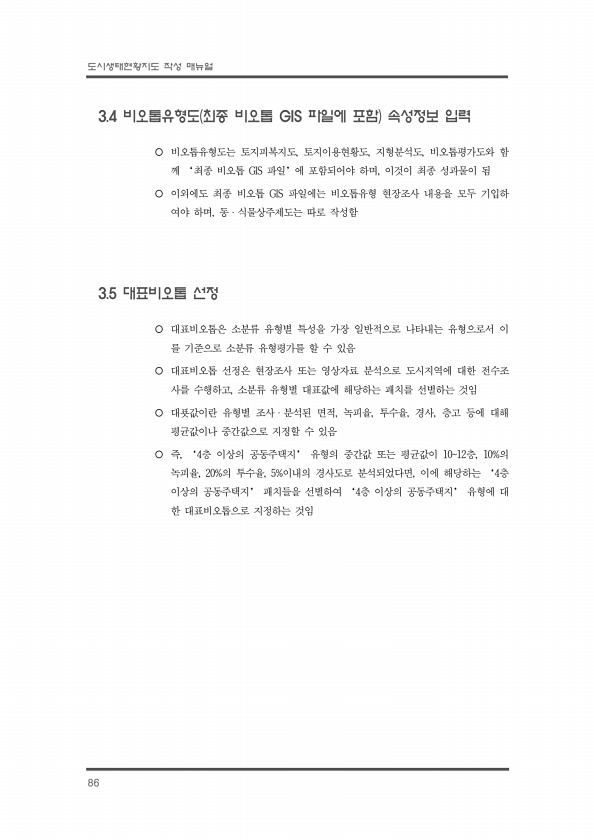 도시생태현황지도 작성 매뉴얼 86 3.4 비오톱유형도 최종 비오톱 GIS 파일에 포함 속성정보 입력 ¡ 비오톱유형도는 토지피복지도, 토지이용현황도, 지형분석도, 비오톱평가도와 함 께 ‘최종 비오톱 GIS 파일’에 포함되어야 하며, 이것이 최종 성과물이 됨 ¡ 이외에도 최종 비오톱 GIS 파일에는 비오톱유형 현장조사 내용을 모두 기입하 여야 하며, 동ㆍ식물상주제도는 따로 작성함 3.5 대표비오톱 선정 ¡ 대표비오톱은 소분류 유형별 특성을 가장 일반적으로 나타내는 유형으로서 이 를 기준으로 소분류 유형평가를 할 수 있음 ¡ 대표비오톱 선정은 현장조사 또는 영상자료 분석으로 도시지역에 대한 전수조 사를 수행하고, 소분류 유형별 대표값에 해당하는 패치를 선별하는 것임 ¡ 대푯값이란 유형별 조사ㆍ분석된 면적, 녹피율...