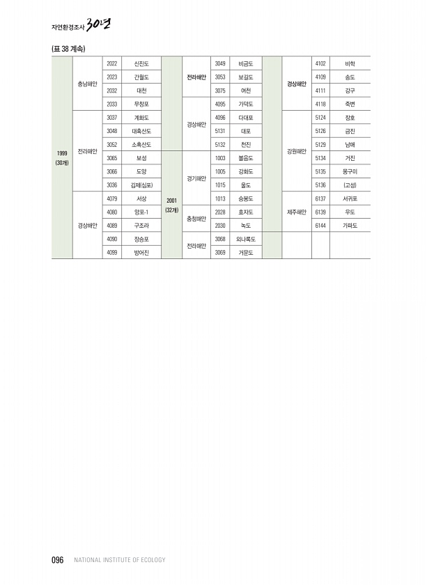 1999 30개 충남해안 2022 신진도 전라해안 3049 비금도 경상해안 4102 비학 2023 간월도 3053 보길도 4109 송도 2032 대천 3075 여천 4111 강구 2033 무창포 경상해안 4095 가덕도 4118 죽변 전라해안 3037 계화도 4096 다대포 강원해안 5124 장호 3048 대흑산도 5131 대포 5126 금진 3052 소흑산도 5132 천진 5129 남애 3065 보성 2001 32개 경기해안 1003 볼음도 5134 거진 3066 도양 1005 강화도 5135 몽구미 3036 김제 심포 1015 울도 5136 고성 경상해안 4079 서상 1013 승봉도 제주해안 6137 서귀포 4080 양포-1 충청해안 2028 효자도 6139 우도 4089 구조라 2030 녹도 6144...