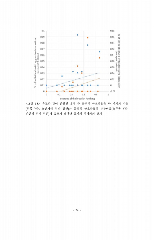 74 그림 4-8 유조와 같이 관찰된 개체 중 공격적 상호작용을 한 개체의 비율 왼쪽 Y축, 오렌지색 점과 점선 과 공격적 상호작용의 관찰비율 오른쪽 Y축, 파란색 점과 점선 과 유조가 태어난 둥지의 성비와의관계