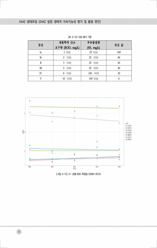 76 DMZ 생태포럼 DMZ 일원 생태적 지속가능성 평가 및 활용 방안 등급 생물학적 산소 요구량 BOD, mg/L 부유물질량 SS, mg/L 등급 값 Ia 1 이하 25 이하 100 Ib 2 이하 25 이하 80 II 3 이하 25 이하 60 III 5 이하 25 이하 40 IV 8 이하 100 이하 20 V 10 이하 100 이상 0 [표 3-15] 수질 평가 기준 [그림 3-15] 시·군별 BOD 측정값 20092013