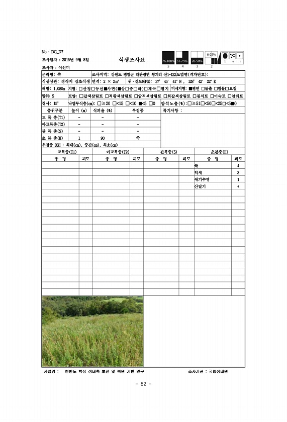 82 No DG_D7 조사일자 2015년 9월 8일 조사자 이선미 식생조사표 군락명쑥 조사지역강원도 평창군 대관령면 횡계리 산1-122도엽명 격자번호 식생상관경작지 잡초식생 면적2 × 2㎡ 위·경도 GPS 37° 45′ 41″N , 128° 42′ 22″E 해발1,080m 지형□산정□능선■사면 ■상□중□하 □계곡□평지 미세지형■평면 □돌출 □함몰□요철 방위S 토양□갈색삼림토 □적황색삼림토 □암적색삼림토 □회갈색삼림토 □침식토 □미숙토 □암쇄토 경사15° 낙엽부식층 cm □≥20 □ 15 □ 10 ■ 5 □0 암석노 출 % □≥51□ 50□ 25□ 5■0 층위구분 높이 m 식피율 % 우점종 특기사항 교 목 층 T1 아교목층 T2 관 목 층 S 초 본 층 H 1 90 쑥 우점종 DBH 최대 cm , 중간 cm ...