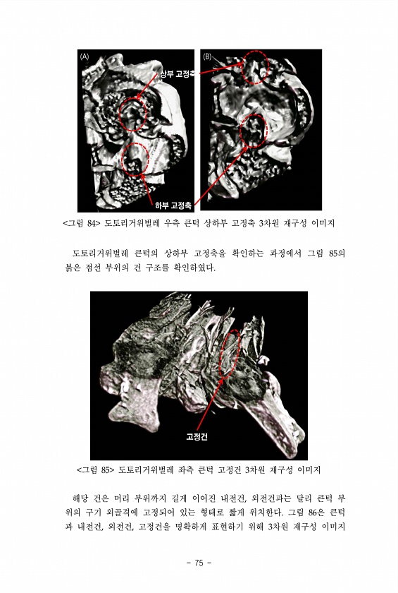75 그림 84 도토리거위벌레 우측 큰턱 상하부 고정축 3차원 재구성 이미지 도토리거위벌레 큰턱의 상하부 고정축을 확인하는 과정에서 그림 85의 붉은 점선 부위의 건 구조를 확인하였다. 그림 85 도토리거위벌레 좌측 큰턱 고정건 3차원 재구성 이미지 해당 건은 머리 부위까지 길게 이어진 내전건, 외전건과는 달리 큰턱 부 위의 구기 외골격에 고정되어 있는 형태로 짧게 위치한다. 그림 86은 큰턱 과 내전건, 외전건, 고정건을 명확하게 표현하기 위해 3차원 재구성이미지