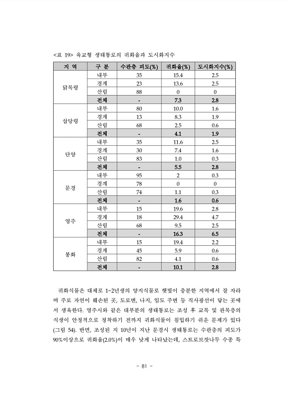81 지 역 구 분 수관층 피도 % 귀화율 % 도시화지수 % 닭목령 내부 35 15.4 2.5 경계 23 13.6 2.5 산림 88 0 0 전체 7.3 2.8 삽당령 내부 80 10.0 1.6 경계 13 8.3 1.9 산림 68 2.5 0.6 전체 4.1 1.9 단양 내부 35 11.6 2.5 경계 30 7.4 1.6 산림 83 1.0 0.3 전체 5.5 2.8 문경 내부 95 2 0.3 경계 78 0 0 산림 74 1.1 0.3 전체 1.6 0.6 영주 내부 15 19.6 2.8 경계 18 29.4 4.7 산림 68 9.5 2.5 전체 16.3 6.5 봉화 내부 15 19.4 2.2 경계 45 5.9 0.6 산림 82 4.1 0.6 전체 10.1 2.8 표 19 육교형 생태통로의 귀화율과 도시화지수 귀화식...