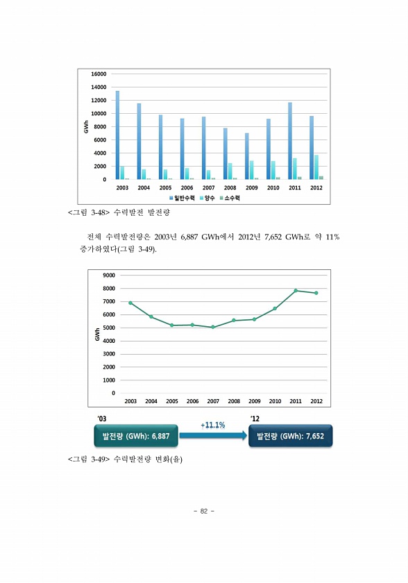 82 그림 3-48 수력발전 발전량 전체 수력발전량은 2003년 6,887 GWh에서 2012년 7,652 GWh로 약 11% 증가하였다 그림 3-49 그림 3-49 수력발전량 변화 율