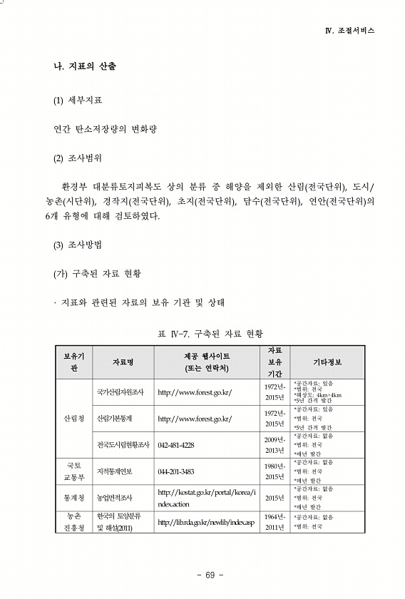 Ⅳ. 조절서비스 69 나. 지표의 산출 1 세부지표 연간 탄소저장량의 변화량 2 조사범위 환경부 대분류토지피복도 상의 분류 중 해양을 제외한 산림 전국단위 , 도시/ 농촌 시단위 , 경작지 전국단위 , 초지 전국단위 , 담수 전국단위 , 연안 전국단위 의 6개 유형에 대해 검토하였다. 3 조사방법 가 구축된 자료 현황 · 지표와 관련된 자료의 보유 기관 및 상태 보유기 관 자료명 제공 또는웹사이트 연락처 자료 보유 기간 기타정보 산림청 국가산림자원조사 http//www.forest.go.kr/ 1972년- 2015년 *공간자료있음 *범위전국 *해상도4km×4km *5년 간격 발간 산림기본통계 http//www.forest.go.kr/ 1972년- 2015년 *공간자료있음 *범위전국 *5년 간격 발간 전국도시...