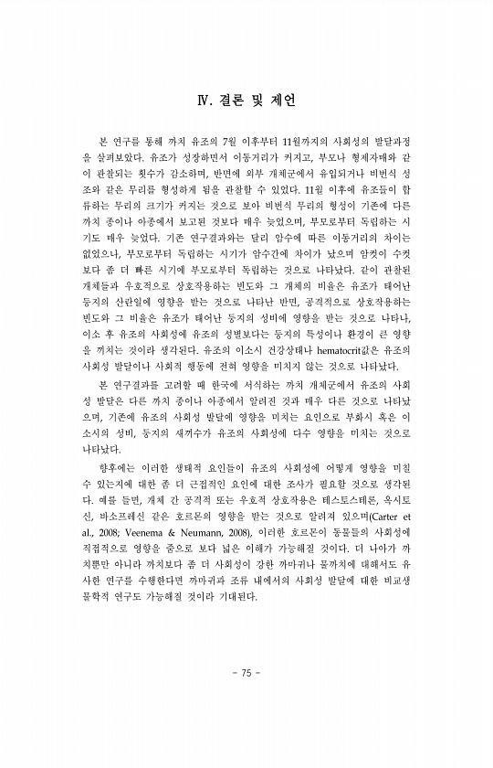 75 Ⅳ. 결론 및 제언 본 연구를 통해 까치 유조의 7월 이후부터 11월까지의 사회성의 발달과정 을 살펴보았다. 유조가 성장하면서 이동거리가 커지고, 부모나 형제자매와 같 이 관찰되는 횟수가 감소하며, 반면에 외부 개체군에서 유입되거나 비번식 성 조와 같은 무리를 형성하게 됨을 관찰할 수 있었다. 11월 이후에 유조들이 합 류하는 무리의 크기가 커지는 것으로 보아 비번식 무리의 형성이 기존에 다른 까치 종이나 아종에서 보고된 것보다 매우 늦었으며, 부모로부터 독립하는 시 기도 매우 늦었다. 기존 연구결과와는 달리 암수에 따른 이동거리의 차이는 없었으나, 부모로부터 독립하는 시기가 암수간에 차이가 났으며 암컷이 수컷 보다 좀 더 빠른 시기에 부모로부터 독립하는 것으로 나타났다. 같이 관찰된 개체들과 우호적으...