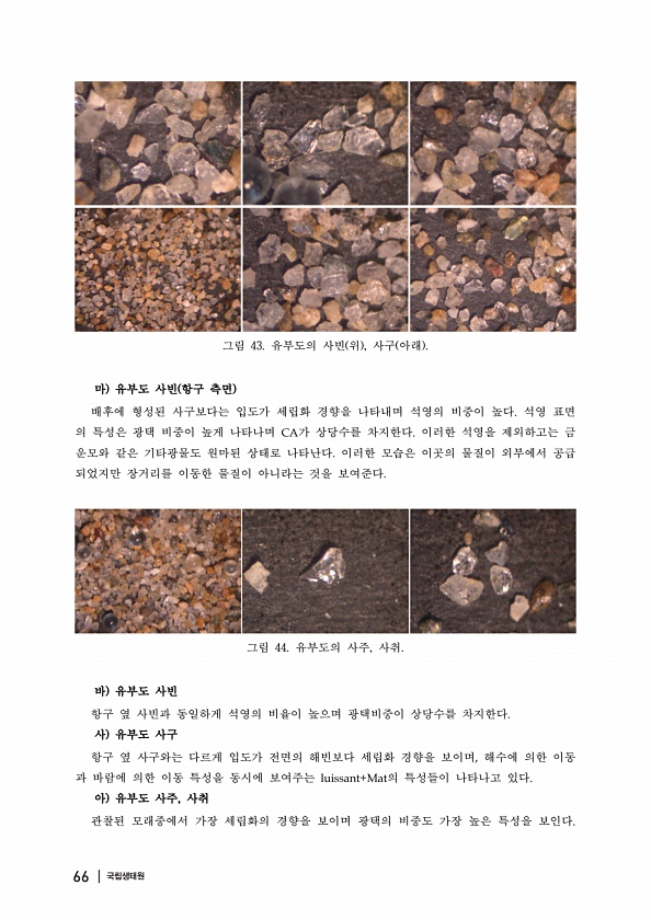 그림 43. 유부도의 사빈 위 , 사구 아래 마 유부도 사빈 항구 측면 배후에 형성된 사구보다는 입도가 세립화 경향을 나타내며 석영의 비중이 높다 석영 표면 의 특성은 광택 비중이 높게 나타나며 가 상당수를 차지한다 이러한 석영을 제외하고는 금 운모와 같은 기타광물도 원마된 상태로 나타난다 이러한 모습은 이곳의 물질이 외부에서 공급 되었지만 장거리를 이동한 물질이 아니라는 것을 보여준다 그림 44. 유부도의 사주, 사취. 바 유부도 사빈 항구 옆 사빈과 동일하게 석영의 비율이 높으며 광택비중이 상당수를 차지한다 사 유부도 사구 항구 옆 사구와는 다르게 입도가 전면의 해빈보다 세립화 경향을 보이며 해수에 의한 이동 과 바람에 의한 이동 특성을 동시에 보여주는 의 특성들이 나타나고 있다 아 유부도 사주, 사취 ...