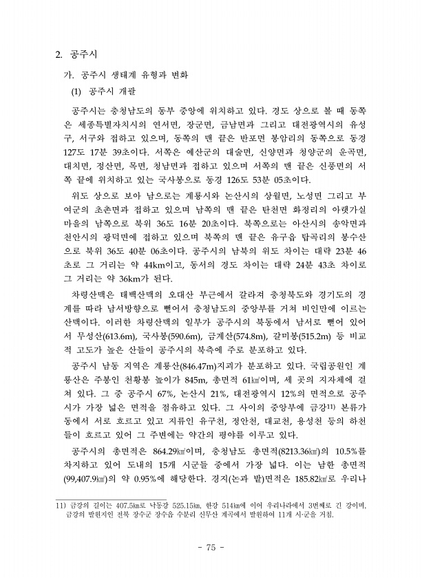 75 공주시 가 공주시 생태계 유형과 변화 공주시 개괄 공주시는 충청남도의 동부 중앙에 위치하고 있다 경도 상으로 볼 때 동쪽 은 세종특별자치시의 연서면 장군면 금남면과 그리고 대전광역시의 유성 구 서구와 접하고 있으며 동쪽의 맨 끝은 반포면 봉암리의 동쪽으로 동경 도 분 초이다 서쪽은 예산군의 대술면 신양면과 청양군의 운곡면 대치면 정산면 목면 청남면과 접하고 있으며 서쪽의 맨 끝은 신풍면의 서 쪽 끝에 위치하고 있는 국사봉으로 동경 도 분 초이다 위도 상으로 보아 남으로는 계룡시와 논산시의 상월면 노성면 그리고 부 여군의 초촌면과 접하고 있으며 남쪽의 맨 끝은 탄천면 화정리의 아랫가실 마을의 남쪽으로 북위 도 분 초이다 북쪽으로는 아산시의 송악면과 천안시의 광덕면에 접하고 있으며 북쪽의 맨 끝은 유구읍 ...