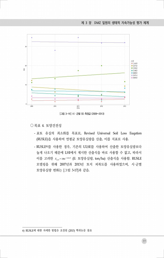 77 제 3 장 DMZ 일원의 생태적 지속가능성 평가 체계 ○ 목표 4. 토양건전성 표토 유실의 최소화를 목표로, Revised Universal Soil Loss Euqation RUSLE 을 사용하여 연평균 토양유실량을 산출, 이를 지표로 사용. RUSLE6 를 사용한 경우, 기존의 ULSE를 사용하여 산출한 토양유실량보다 높게 나오기 때문에 LHI에서 제시한 산출식을 바로 사용할 수 없고, 따라서 이를 고려한 ???? ? E토양유실량, ton/ha 산출식을 사용함. RUSLE 모델링을 위해 2007년과 2013년 토지 피복도를 사용하였으며, 시·군별 토양유실량 변화는 [그림 3-17]과 같음. 6 RUSLE에 대한 자세한 방법은 오경원 2013 학위논문 참조 [그림 3-16] 시...