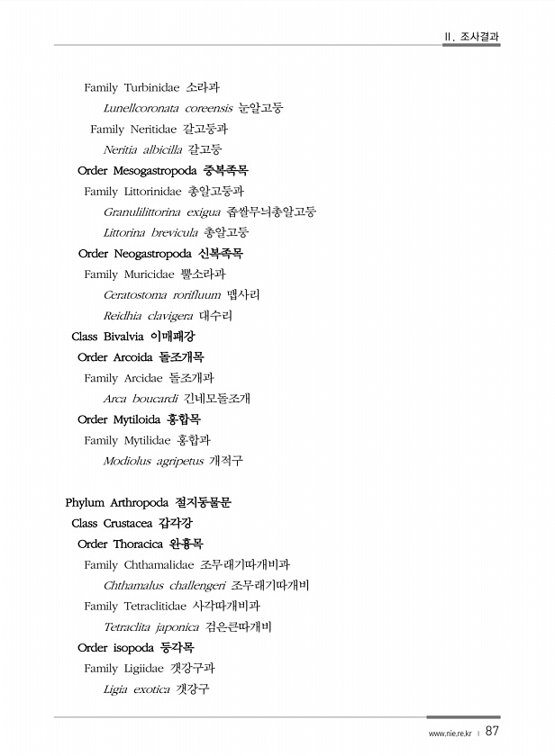 Ⅱ. 조사결과 www.nie.re.kr ? 87 Family Turbinidae 소라과 Lunellcoronata coreensis 눈알고둥 Family Neritidae 갈고둥과 Neritia albicilla 갈고둥 Order Mesogastropoda 중복족목 Family Littorinidae 총알고둥과 Granulilittorina exigua 좁쌀무늬총알고둥 Littorina brevicula 총알고둥 Order Neogastropoda 신복족목 Family Muricidae 뿔소라과 Ceratostoma rorifluum 맵사리 Reidhia clavigera 대수리 Class Bivalvia 이매패강 Order Arcoida 돌조개목 Family Arcidae 돌조개과 Arca boucardi...