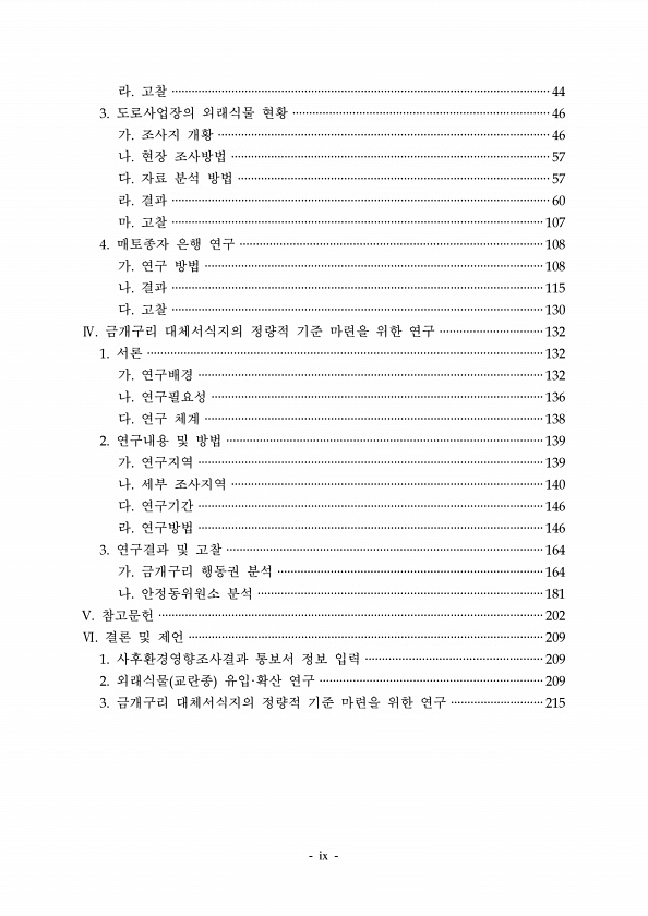 라 고찰 도로사업장의 외래식물 현황 가 조사지 개황 나 현장 조사방법 다 자료 분석 방법 라 결과 마 고찰 매토종자 은행 연구 가 연구 방법 나 결과 다 고찰 금개구리 대체서식지의 정량적 기준 마련을 위한 연구 서론 가 연구배경 나 연구필요성 다 연구 체계 연구내용 및 방법 가 연구지역 나 세부 조사지역 다 연구기간 라 연구방법 연구결과 및 고찰 가 금개구리 행동권 분석 나 안정동위원소 분석 참고문헌 결론 및 제언 사후환경영향조사결과 통보서 정보 입력 외래식물 교란종 유입 확산 연구 금개구리 대체서식지의 정량적 기준 마련을 위한연구