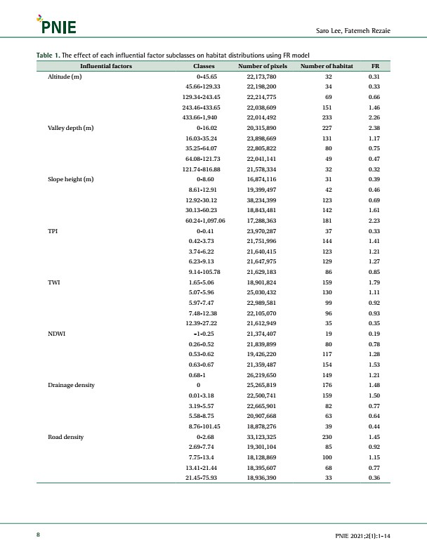 Saro Lee, Fatemeh Rezaie 8 PNIE 2021;2 1 1-14 Table 1. The effect of each influential factor subclasses on habitat distributions using FR model Influential factors Classes Number of pixels Number of habitat FR Altitude m 0-45.65 22,173,780 32 0.31 45.66-129.33 22,198,200 34 0.33 129.34-243.45 22,214,775 69 0.66 243.46-433.65 22,038,609 151 1.46 433.66-1,940 22,014,492 233 2.26 Valley depth m 0-16....