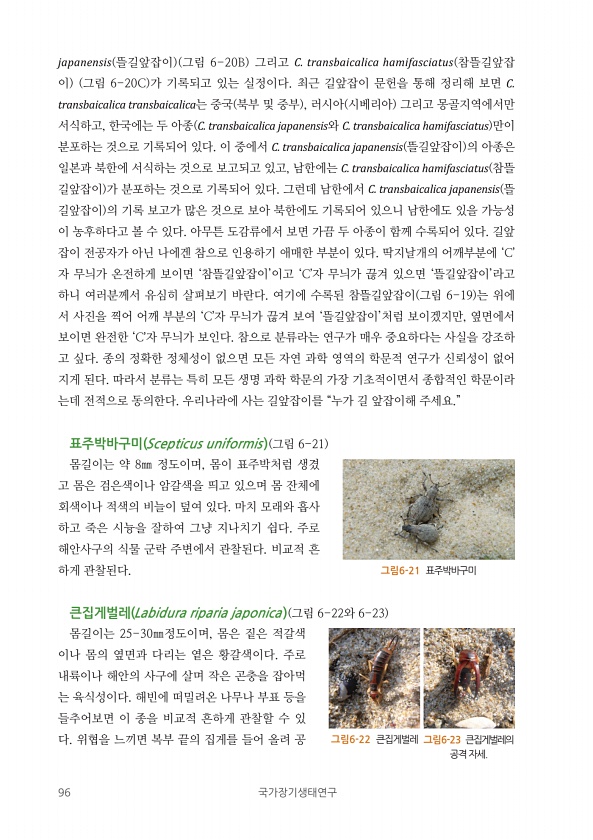 96 국가장기생태연구 japanensis 뜰길앞잡이 그림 6-20B 그리고 C. transbaicalica hamifasciatus 참뜰길앞잡 이 그림 6-20C 가 기록되고 있는 실정이다. 최근 길앞잡이 문헌을 통해 정리해 보면 C. transbaicalica transbaicalica는 중국 북부 및 중부 , 러시아 시베리아 그리고 몽골지역에서만 서식하고, 한국에는 두 아종 C. transbaicalica japanensis와 C. transbaicalica hamifasciatus 만이 분포하는 것으로 기록되어 있다. 이 중에서 C. transbaicalica japanensis 뜰길앞잡이 의 아종은 일본과 북한에 서식하는 것으로 보고되고 있고, 남한에는 C. transbaicalica hamifasc...