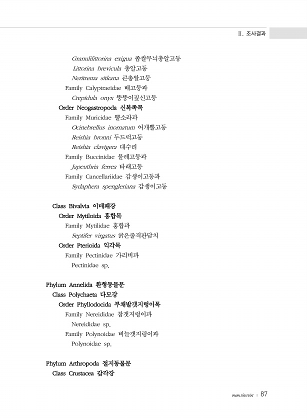 Ⅱ. 조사결과 www.nie.re.kr ? 87 Granulilittorina exigua 좁쌀무늬총알고둥 Littorina brevicula 총알고둥 Neritrema sitkana 큰총알고둥 Family Calyptraeidae 배고둥과 Crepidula onyx 뚱뚱이짚신고둥 Order Neogastropoda 신복족목 Family Muricidae 뿔소라과 Ocinebrellus inornatum 어개뿔고둥 Reishia bronni 두드럭고둥 Reishia clavigera 대수리 Family Buccinidae 물레고둥과 Japeuthria ferrea 타래고둥 Family Cancellariidae 감생이고둥과 Sydaphera spengleriana 감생이고둥 Class Bivalvia 이매패...