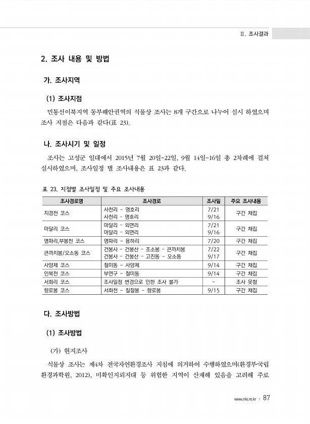 Ⅱ. 조사결과 www.nie.re.kr ? 87 2. 조사 내용 및 방법 가. 조사지역 1 조사지점 민통선이북지역 동부해안권역의 식물상 조사는 8개 구간으로 나누어 실시 하였으며 조사 지점은 다음과 같다 표 23 나. 조사시기 및 일정 조사는 고성군 일대에서 2015년 7월 20일22일, 9월 14일16일 총 2차례에 걸쳐 실시하였으며, 조사일정 별 조사내용은 표 23과 같다. 조사경로명 조사경로 조사일 주요 조사내용 지경천 코스 사천리 명호리 사천리 ? 명호리 7/21 9/16 구간 채집 마달리 코스 마달리 ? 외면리 마달리 ? 외면리 7/21 9/16 구간 채집 명파리,부봉천 코스 명파리 용하리 7/20 구간 채집 큰까치봉/오소동 코스 건봉사 ? 건봉산 ? 조소봉 ? 큰까치봉 건봉사 ? 건봉산 ? 고진동...