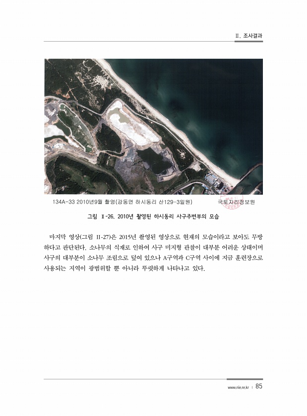 Ⅱ. 조사결과 www.nie.re.kr ? 85 그림 Ⅱ-26. 2010년 촬영된 하시동리 사구주변부의 모습 마지막 영상 그림 Ⅱ-27 은 2015년 촬영된 영상으로 현재의 모습이라고 보아도 무방 하다고 판단된다. 소나무의 식재로 인하여 사구 미지형 관찰이 대부분 어려운 상태이며 사구의 대부분이 소나무 조림으로 덮여 있으나 A구역과 C구역 사이에 지금 훈련장으로 사용되는 지역이 광범위할 뿐 아니라 뚜렷하게 나타나고있다.