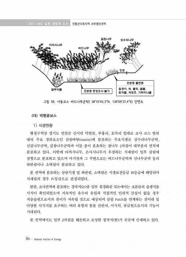 2017 DMZ 일원 생태계 조사 민통선이북지역 서부평야권역 86 ? National Institute of Ecology 그림 59. 사동코스 버드나무군락 38°10′43.3″N. 126°59′37.4″E 단면도 다 덕현골코스 1 식생현황 행정구역상 경기도 연천군 신서면 덕현골, 부흥리, 호막리 일대로 조사 코스 범위 내의 주요 경관요소인 삼림바탕 matrix 에 분포하는 주요식생은 상수리나무군락, 신갈나무군락, 갈참나무군락과 이들 종이 혼효하는 참나무 2차림이 대부분의 면적에 분포하고 있다. 이밖에 아까시나무, 은사시나무가 우점하는 식재림이 일부 삼림에 점형으로 분포하고 있으며 마거천과 그 주변으로는 버드나무군락과 신나무군락 등의 하반림이나 소택림이 분포하고 있다. 본 권역에 분포하는 삼림식생 및 하반림...