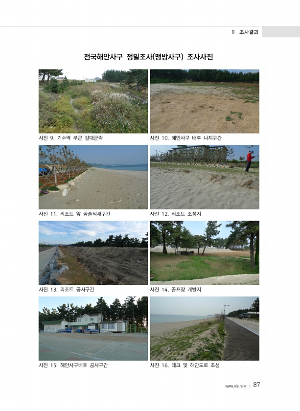 Ⅱ. 조사결과 www.nie.re.kr ? 87 전국해안사구 정밀조사 맹방사구 조사사진 사진 9. 기수역 부근 갈대군락 사진 10. 해안사구 배후 나지구간 사진 11. 리조트 앞 곰솔식재구간 사진 12. 리조트 조성지 사진 13. 리조트 공사구간 사진 14. 골프장 개발지 사진 15. 해안사구배후 공사구간 사진 16. 데크 및 해안도로조성