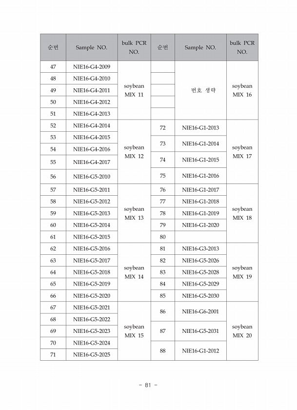 순번 Sample NO. bulk PCR NO. 순번 Sample NO. bulk PCR NO. 47 NIE16-G4-2009 soybean MIX 11 번호 생략 soybean MIX 16 48 NIE16-G4-2010 49 NIE16-G4-2011 50 NIE16-G4-2012 51 NIE16-G4-2013 52 NIE16-G4-2014 soybean MIX 12 72 NIE16-G1-2013 soybean MIX 17 53 NIE16-G4-2015 73 NIE16-G1-2014 54 NIE16-G4-2016 74 NIE16-G1-2015 55 NIE16-G4-2017 56 NIE16-G5-2010 75 NIE16-G1-2016 57 NIE16-G5-2011 soybean MIX 13 76 NIE16-G...