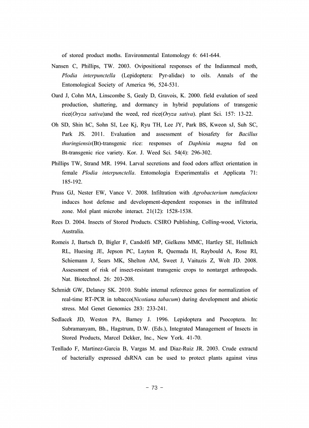 73 of stored product moths. Environmental Entomology 6641-644. Nansen C, Phillips, TW. 2003. Ovipositional responses of the Indianmeal moth, Plodia interpunctella LepidopteraPyr-alidae to oils. Annals of the Entomological Society of America 96, 524-531. Oard J, Cohn MA, Linscombe S, Gealy D, Gravois, K. 2000. field evalution of seed production, shattering, and dormancy in hybrid populations of tra...