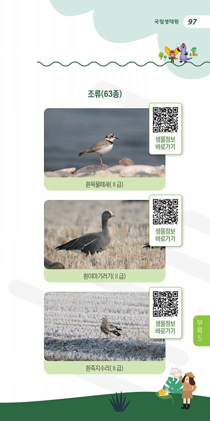 97 조류 63종 흰목물떼새 Ⅱ급 흰이마기러기 Ⅱ급 흰죽지수리 Ⅱ급 생물정보 바로가기 생물정보 바로가기 생물정보 바로가기 부 록5
