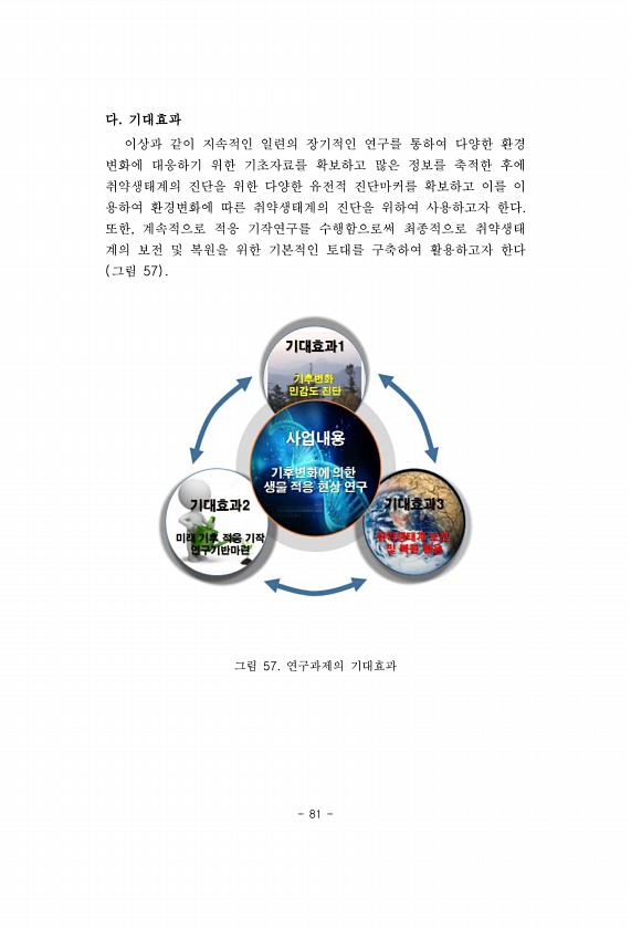 81 다. 기대효과 이상과 같이 지속적인 일련의 장기적인 연구를 통하여 다양한 환경 변화에 대응하기 위한 기초자료를 확보하고 많은 정보를 축적한 후에 취약생태계의 진단을 위한 다양한 유전적 진단마커를 확보하고 이를 이 용하여 환경변화에 따른 취약생태계의 진단을 위하여 사용하고자 한다. 또한, 계속적으로 적응 기작연구를 수행함으로써 최종적으로 취약생태 계의 보전 및 복원을 위한 기본적인 토대를 구축하여 활용하고자 한다 그림 57 그림 57. 연구과제의기대효과