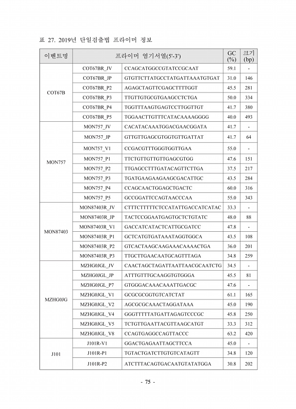 75 27. 2019 5-3GC % bp COT67B COT67BR_JV CCAGCATGGCCGTATCCGCAAT 59.1 COT67BR_JP GTGTTCTTATGCCTATGATTAAATGTGAT 31.0 146 COT67BR_P2 AGAGCTAGTTCGAGCTTTTGGT 45.5 281 COT67BR_P3 TTGTTGTGCGTGAAGCCTCTGA 50.0 334 COT67BR_P4 TGGTTTAAGTGAGTCCTTGGTTGT 41.7 380 COT67BR_P5 TGGAACTTGTTTCATACAAAAGGGG 40.0 493 MON757 MON757_JV CACATACAAATGGACGAACGGATA 41.7 MON757_JP GTTGTTGAGCGTGGTGTTGATTAT 41.7 64 MON757_V1 CCGA...