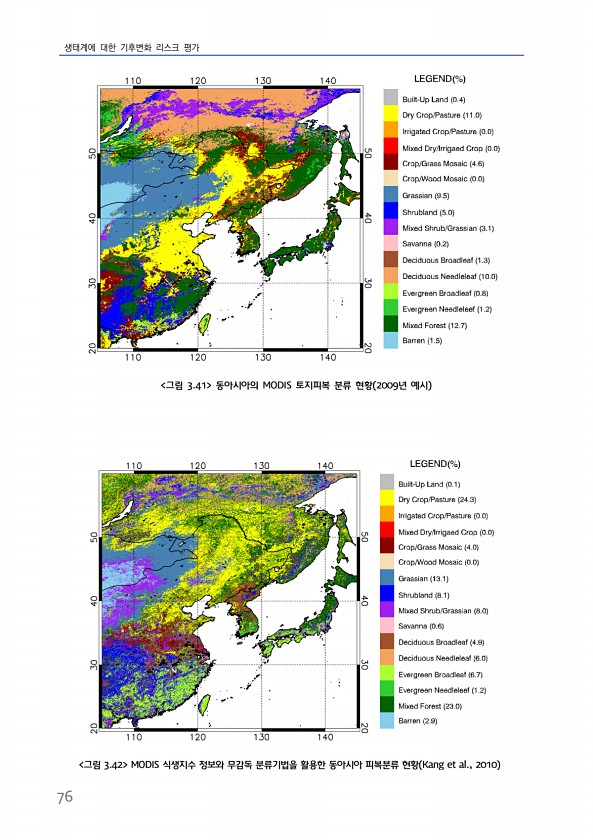 생태계에 대한 기후변화 리스크 평가 76 그림 3.42 MODIS 식생지수 정보와 무감독 분류기법을 활용한 동아시아 피복분류 현황 Kang et al., 2010 그림 3.41 동아시아의 MODIS 토지피복 분류 현황 2009년 예시