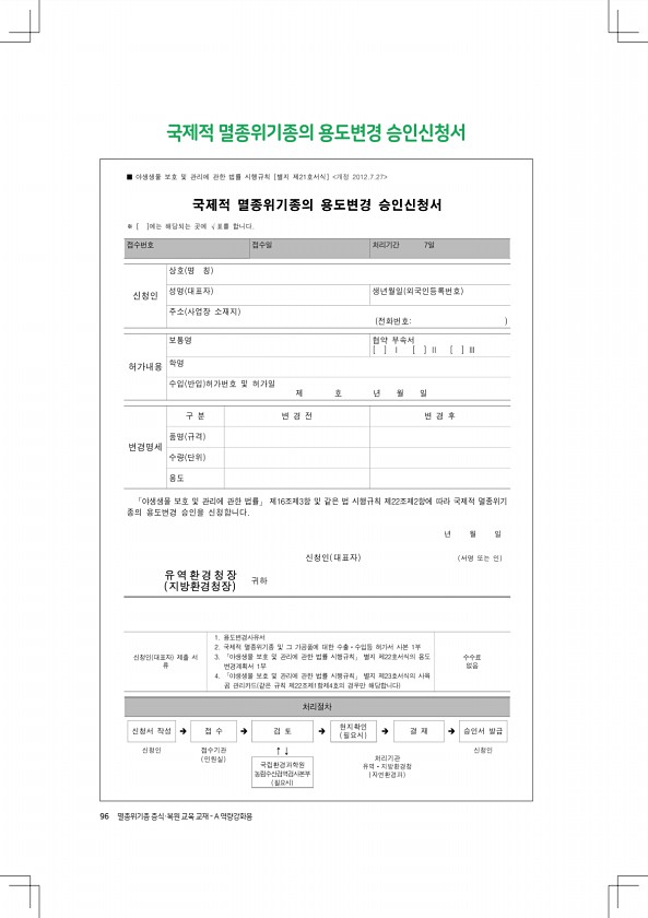 96 멸종위기종 증식·복원 교육 교재 A 역량강화용 국제적 멸종위기종의 용도변경승인신청서