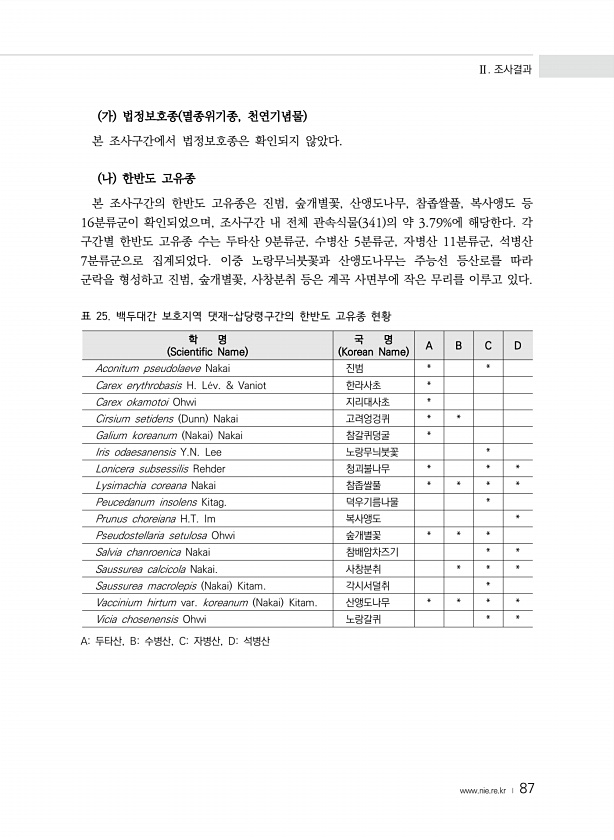Ⅱ. 조사결과 www.nie.re.kr ? 87 가 법정보호종 멸종위기종, 천연기념물 본 조사구간에서 법정보호종은 확인되지 않았다. 나 한반도 고유종 본 조사구간의 한반도 고유종은 진범, 숲개별꽃, 산앵도나무, 참좁쌀풀, 복사앵도 등 16분류군이 확인되었으며, 조사구간 내 전체 관속식물 341 의 약 3.79%에 해당한다. 각 구간별 한반도 고유종 수는 두타산 9분류군, 수병산 5분류군, 자병산 11분류군, 석병산 7분류군으로 집계되었다. 이중 노랑무늬붓꽃과 산앵도나무는 주능선 등산로를 따라 군락을 형성하고 진범, 숲개별꽃, 사창분취 등은 계곡 사면부에 작은 무리를 이루고 있다. 표 25. 백두대간 보호지역 댓재삽당령구간의 한반도 고유종 현황 학 명 Scientific Name 국 명 Korean Name ...
